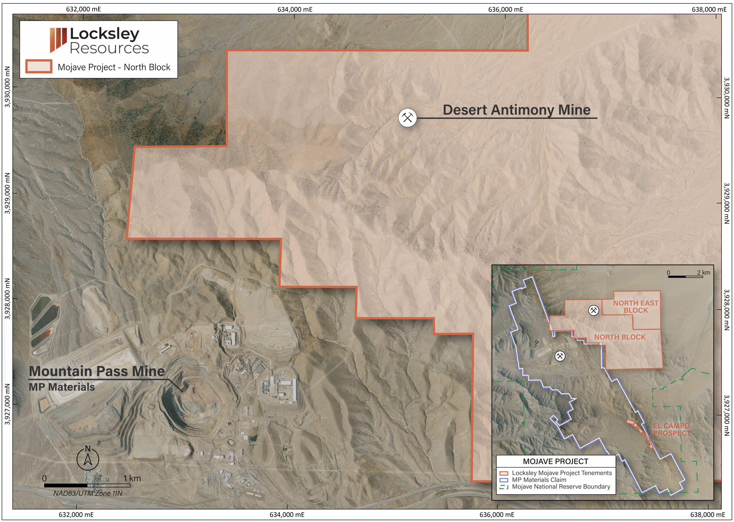 The Desert Antimony Prospect builds on the legacy of one of California’s few historical antimony mines. With surface assays as high as 46% Sb and outcropping quartz-calcite-stibnite veins, this project offers both exceptional grade and scale potential. Locksley is advancing drilling and permitting to reintroduce domestic antimony production to the U.S. market.